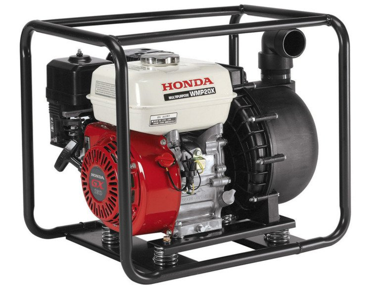 WMP20X Honda - 1WMP20X Honda- to specjalistyczna motopompa przeznaczona do przepompowywania substancji (cieczy) chemicznych. Specjalny materiał z którego został wykonany korpus części pompowej umożliwia stosowanie motopompy do cieczy chemicznych o współczynniku pH od 4 do 9, zaczynając od kwasów na zasadach kończąc. Korpus WMP20X Honda wykonany jest z włókna szklanego pokrytego specjalnym poliestrem. Charakterystyka WMP20X Honda-1Motopompa może być stosowana do nawozu saletrzano- mocznikowego tzw. RSM. Jest to jedyna motopompa w ofercie Hondy, którą można pompować również wodę pitną. Temperatura pracy motopompy WMP20X Honda powinna zawierać  się w przedziale - 7 ÷ + 54 °C. Do ważnych elementów poprawnej eksploatacji motopompy WMP20X Honda należą dwie czynności. Pierwsza- polega na każdorazowym wpłukaniu korpusu czystą, słodką wodą. Druga dotyczy pompowania słonej wody. Przed i po pompowaniem słonej wody należy nasmarować ruchome części regulatora obrotów i gaźnika. WMP20X napędza  profesjonalny silnik GX160 wyposażony w tzw. oil Alert czyli alarm olejowy. Jego zadaniem jest niedopuszczenie do uruchomienia silnika w przypadku zbyt małej ilości oleju w misce olejowej. Odpowiednie zestawienie mocy silnika (4,8 KM) wraz ze specjalnie zaprojektowanym korpusem oraz ślimakiem umożliwiło osiągnięcie bardzo dobrych parametrów pracy. Wydajność wynosi do 833 l/min. Maksymalne możliwe ciśnienie to 2,5 bara.